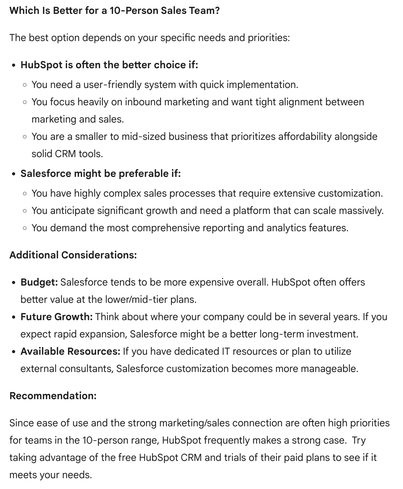 Yesterday, Tomasz Tunguz posted this image on Twitter. Typing “Compare Salesforce & Hubspot for a 10-person sales team. Which is better?” into Gemini produces this result: